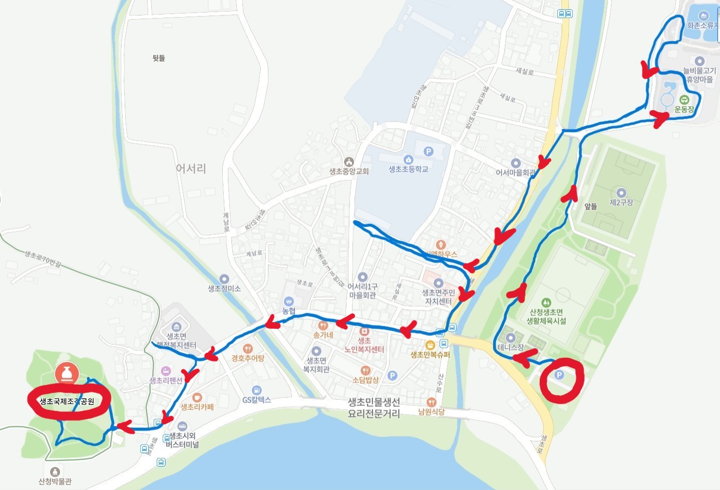 공원 밖으로 나오니 도로와 공원사이에 자그마한 주차장 (경남 산청군 생초면 어서리 780 ) 이 있어요.